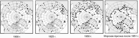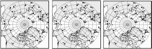 Рис. 1. Метеорологические станции в Северном полушарии севернее 60° с.ш. в разные периоды ХХ столетия