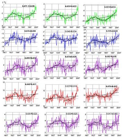 В ноябре, декабре и январе первое потепление развивалось значительно интенсивнее по сравнению с последним потеплением, а в остальные месяцы тренд во второй период был намного сильнее. Особенно велико различие в скорости потепления в июне. Изменение числа «теплых» (Т>95 % уровня) месяцев в 9-летних скользящих интервалах показывает, что в последние 20 лет число «теплых» июней на 41 станции севернее 60° с.ш. увеличилось почти вдвое.