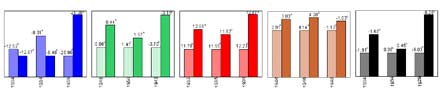 Рис. 3. Средняя ПТВ в самое теплое десятилетия в первом потеплении (первый столбик) и в 1998–2007 гг. (второй столбик) в разные сезоны (слева на право – зима, весна, лето, осень, год) во всей области, в приатлантической и притихоокеанской ее половинах (соответственно, первая, вторая и третья пара столбиков в каждом сезоне)