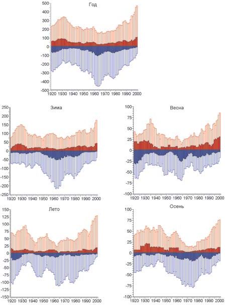 Рис. 4. Количество очень теплых (>95 %-уровня) и холодных (<5 %-уровня) месяцев, просуммированное по сезонам, за год и по 9-летним скользящим интервалам 1921–2008 гг. Год на шкале времени относится к началу 9-летнего интервала. Отрицательные значения на вертикальной оси относятся к очень холодным месяцам. Более темный цвет соответствует распределению экстремумов