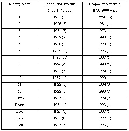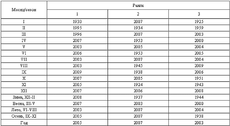 Указанные особенности потеплений подтверждаются распределением рангов отдельных месяцев за 1901–2009 гг. (таблица 1). С апреля по декабрь все самые «теплые» месяцы приходятся на период с 2003 по 2009 год. Лишь самый «теплый» январь был в 1930 году, а февраль и март – в 1995 и 1996 гг. Наибольшее число самых «теплых» месяцев (по 3) отмечено в 2003 и 2007 гг., самым «теплым» годом стал 2005-й, самое теплое лето пришлось на 2003 год, зима – на 2008 год, весна – на 2007 г., осень – на 2005 год.
