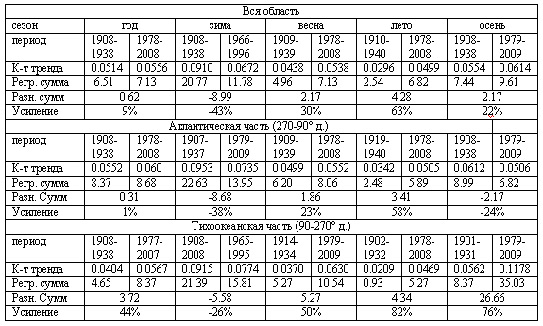 Коэффициенты тренда за весь период для всех рядов положительны и, за исключением 5 рядов, значимы на 95 % и более уровне. Для всех рассматриваемых областей осенние тренды минимальны и незначимы, а весенние все значимы. В целом тренды сильнее в тихоокеанской, чем в атлантической половине области. При этом оценки трендов неустойчивы к сдвигу начала ряда на более поздние годы. Коэффициенты тренда быстро убывают по мере приближения начала ряда к 1925 году вплоть до смены знака тренда для зимы.