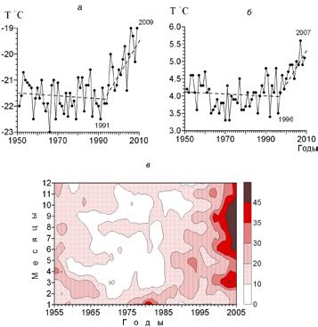 Средняя за зимние (ноябрь – март) и летние (июнь – август) месяцы приповерхностная температура воздуха (ПТВ) на станциях в морской Арктике показана, начиная с 1951 года, на рис. 6. Видно быстрое убывание отрицательных температур после 1991 года и быстрый рост положительных температур после 1996 года с абсолютным рекордом в 2007 году и понижением в 2008 году. При этом зимние температуры до 1991 года и летние до 1996 года имели слабые отрицательные тренды, которые сменились на значимые положительные тренды.