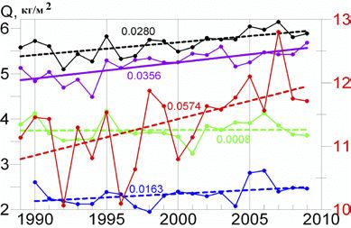 Рис. 7. Общее содержание водяного пара в атмосфере к северу от 70° с.ш. в разные сезоны и в среднем за год в 1989–2009 гг. по данным (ERA-40, http://www.ecmwf.int). Цифры означают коэффициент тренда