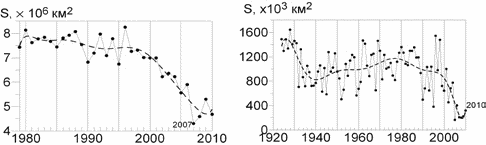 Морской ледВо взаимодействии между Арктикой и остальной частью глобальной климатической системы важная роль принадлежит морскому ледяному покрову, который в то же время является индикатором изменений арктического климата. Наблюдаемое с начала 1980-х годов постепенное сокращение летней площади морского льда (ПМЛ) в Арктике резко ускорилось в конце 1990-х годов и достигло абсолютного минимума в сентябре 2007 года (4,28 млн км2). В сентябре 2008 года ПМЛ по данным NSIDC возросла до 4,70 млн км2, в сентябре 2009 года до 5,20 млн км2, а в сентябре 2010 года вновь уменьшилась до 4.90 млн км2 (рис. 8).