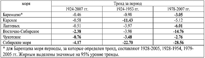 Сопоставление трендов ПМЛ в арктических морях за полный период наблюдений, за 30-летние периоды потеплений в Арктике и за последние десять лет указывают на однозначную тенденцию к сокращению ПМЛ во все рассматриваемые периоды с ее усилением к последнему десятилетию для Сибирских морей в целом (таблица 4). Отдельные моря также показывают ускорение сокращения ПМЛ в последнее десятилетие. В 30-летие 1924–1954 гг. ПМЛ сокращалась сильнее по сравнению с 30-летием 1977–2007 в Карском море и в меньшей степени в Чукотском море.