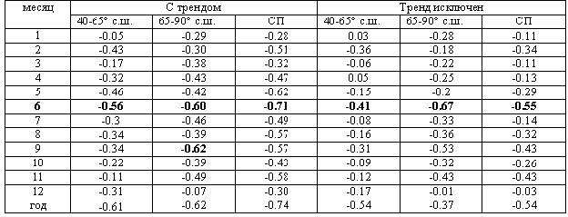 Таблица 5. Коэффициенты корреляции между ПМЛ в Северном полушарии (по данным Chapman and Walsh, 2003) и ПТВ в широтных зонах по данным из ERA-40 (Rayner et al., 2003) в разные месяцы (1–12) и за год за период 1958–1998 гг. 95 %-уровень значимости коэффициентов равен 0.31
