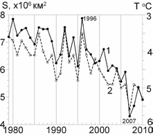 Рис. 9. Площадь, занятая морским льдом в Арктике в сентябре по данным NSIDC (1), и средняя температура воздуха в июне – сентябре в морской Арктике на 41 станции (2). Шкала температуры повернута на 180°