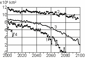Результаты расчетов будущего арктических морских льдов на глобальных моделях климата представлены во многих публикациях, включая четвертый оценочный доклад МГЭИК (IPCC, 2007). Характерной чертой ансамбля проекций по разным моделям является значительный разброс, возрастающий к концу 21-го века. На рис. 10 а приведены среднее по ансамблю из 16 моделей и крайние члены ансамбля, соответствующие наиболее быстрому (1) и наиболее медленному (2) сокращению ПМЛ в сентябре. Видно, что наблюдаемое сокращение площади льда значительно опережает модельные реализации.