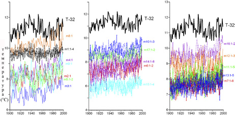 Сопоставление изменений температуры АВ в Арктическом бассейне и в Cеверной Атлантике, начиная от тропической области (рис. 15), показывает присутствие во всех рассматриваемых рядах сходных междесятилетних изменений с преобладанием роста температуры в последние 30 лет. Исключение составляет район 40°–60° с.ш., где имеет место оппозиция аномалий температуры между восточной и западной частями района.