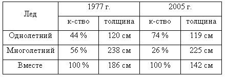 Таблица 6. Количество и средняя толщина льдов различного возраста на пути плавания а/л «Арктика» в августе 1977 г. и НЭС «Академик Федоров» в августе 2005 г (Фролов и др., 2009)