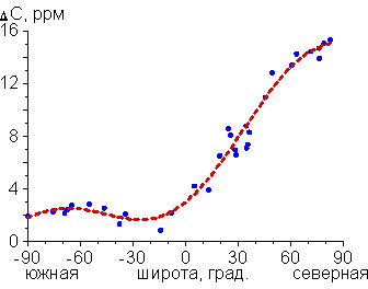 Исследования в Арктике выявили ряд особенностей в распределении концентрации СО2 над морскими льдами (Semiletov et al., 2004; Голубев и др. 2006). Сезонные колебания концентрации СО2 в атмосфере по данным глобальной сети мониторинга показывают зависимость амплитуд годового хода от широты с явной тенденцией к их возрастанию в направлении высоких широт Северного полушария (рис. 12). Это арктическое усиление амплитуды годовых колебаний концентрации СО2 над Северным Ледовитым океаном было связано (Алексеев, Нагурный, 2005; 2007;. Алексеев и др., 2007а) с активным с влиянием морского льда на формирование сезонного цикла концентрации СО2 в атмосфере над морским льдом. Было показано, что амплитуда растет в основном за счет роста зимней концентрации СО2, который согласуется с ростом амплитуды сезонных колебаний ПМЛ за счет увеличения летнего сокращения. Было выдвинуто предположение, что образование, нарастание и изменение структуры льда в зимний сезон на все большей акватории должно сопровождаться увеличением выделения СО2 в атмосферу и в подледный слой воды. Летом СО2 из атмосферы над Арктическим бассейном должен поглощаться опресненной водой на поверхности льда, в разводьях, трещинах и каналах, а также расходоваться на фотосинтез в верхнем слое воды и во льду (Semiletov et al., 2004; Rysgaard et al., 2007).