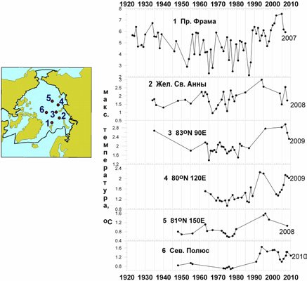 Рис. 13. Изменения максимальной температуры в слое АВ по данным измерений в шести районах Арктического бассейна (на карте слева) по данным 1920–2009 гг.