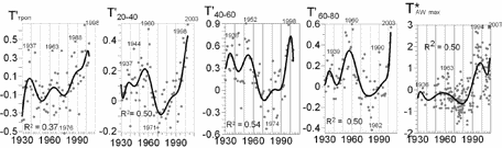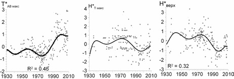 Несмотря на значительный разброс нормированных аномалий, аппроксимация ортогональными полиномами выделяет междесятилетние колебания характеристик с соответствующими экстремумами. Максимумы температуры АВ приходятся на 1930-е, 1950-е и 1990–2000-е гг. Соответствующие им минимумы глубины максимальной температуры и глубины верхней границы слоя АВ приходятся на эти же периоды.