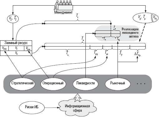 Связанный с реализацией части актива риск Rл называется риском ликвидности. На этот риск влияют три фактора: VЛ – объем ликвидных активов, CЛ – стоимость этих активов и TЛ – время их реализации. Из них VЛ по сути есть характеристика структуры (количества и характера) активов – внутренний (управляемый) фактор организации, а CЛ и TЛ – это внешние факторы, зависящие от величины рыночного риска.