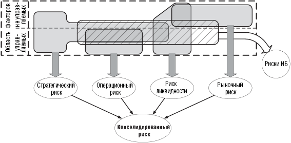 В общем случае риски определены на множествах факторов, влияющих на них. Эти множества могут пересекаться. Если от некоторого фактора зависят два или более рисков, то эти риски оказываются взаимозависимыми. Их значения будут коррелированны, поскольку изменение общего для них фактора приведет к одновременному изменению этих рисков. Эта ситуация иллюстрируется рис. 7, где в области факторов показаны пересекающиеся множества управляемых и неуправляемых факторов, от которых зависят разные виды рисков.
