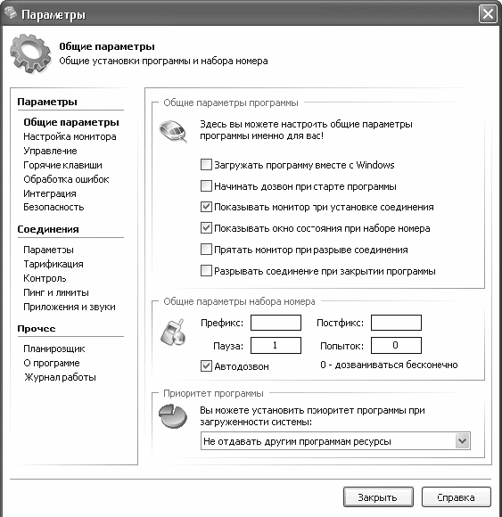 После запуска MuxaSoft Dialer ее значок появляется в области уведомлений, и работа осуществляется через контекстное меню программы. Для дозвона необходимо выбрать пункт Звонить. Управлять соединениями и режимами работы утилиты можно с помощью меню Параметры. Подраздел Параметры в разделе Соединения позволяет задать несколько телефонов для одного соединения, которые программа будет перебирать в случае проблем или ошибок. Кроме того, можно задать интервалы времени, в которые не нужно пытаться соединяться с провайдером (рис. 1.4).