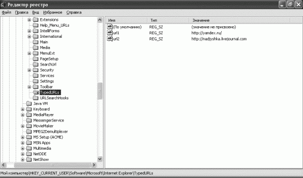 Internet Explorer сохраняет в своей адресной строке последние введенные пользователем адреса, их список можно отредактировать и удалить ненужные ссылки. Для этого в разделе системного реестра HKEY_CURRENT_USER\Software\ Microsoft\Internet Explorer\Typed URLs (рис. 2.3) следует удалить ненужные параметры.