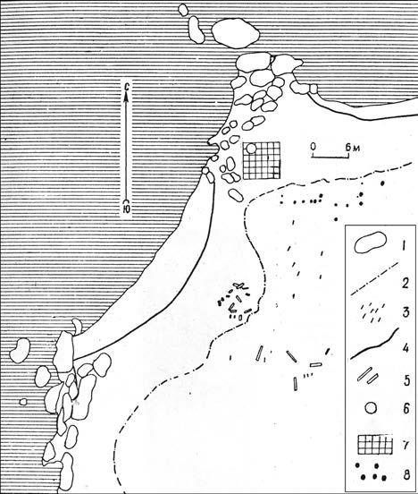 1 – камни; 2 – граница тундры; 3 – древний плавник; 4 – граница древнего галечного вала; 5 – остатки лодки; 6 – гурий; 7 – раскоп; 8 – поплавки от сети