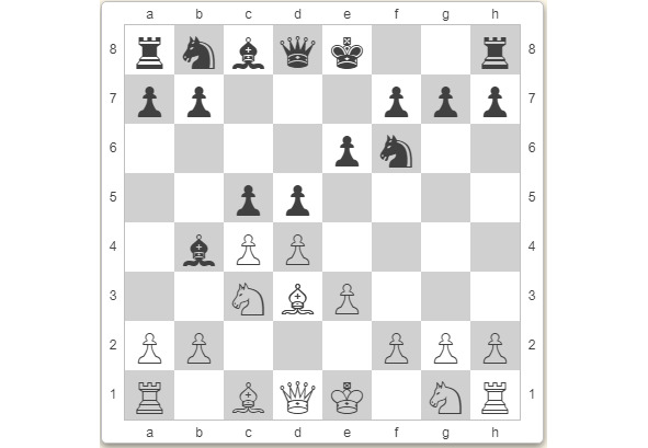 Вновь чёрный солдат лихо идёт вперёд, угрожая пикой и ехидно улыбаясь. Это позиционная жертва пешки, и брать её можно только конём: взятие слоном невозможно из-за броска чёрного солдата на b5, и белые без фигуры.
