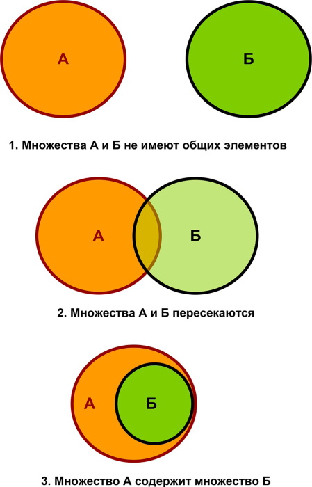Кроме двух вышеописанных свойств сверхчеловеческой праматематики, операции в ней могут осуществляться с любым числом объектов, в любой последовательности, неограниченное число раз и вообще любым, даже невообразимым образом. Например, рассмотрим трудно воображаемый пример из теории множеств. Как известно, между множествами возможны три отношения (операции), которые рассмотрим, вначале, на примере двух множеств. Пусть это будут, для наглядности, два круга на бумаге, которые находятся в следующих взаимоотношениях (рис. 4.1.): 1) множества не имеют общих элементов, то есть они отделены друг от друга и на листе бумаге круги изображаются отдельно; 2) каждое множество включает лишь часть другого, то есть на листе бумаги круги пересекаются; 3) одно множество является частью другого, то есть на листе бумаги один круг находится внутри другого. В сверхчеловеческой праматематике не только неограниченное число каждой из разновидностей множеств, но и операций между ними не три вышеуказанные, а также неограниченное число. Кроме вышеупомянутых трех операций между указанными множествами, другие вообразить невозможно, что связано с простой структурой элементов этих множеств (точки). Но при усложнении объекта, увеличится, соответственно, и число операций между ними, как это было отмечено выше.