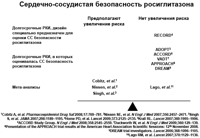 Рис. 2.3. Метаанализ, где в одной группе работ показано увеличение сердечно-сосудистого (СС) риска на фоне лечения росиглитазоном, а в другом метаанализе – нет. РКИ – рандомизированное клиническое исследование