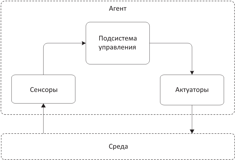 Каждый агент – это полноценная кибернетическая машина, которая имеет систему управления, непрерывно получающую информацию с сенсорных систем агента и воздействующую на окружающую среду при помощи исполнительных устройств (или актуаторов). При этом подход не определяет сущность сенсорных систем и актуаторов – их природа может быть произвольной. Поэтому агентный подход одинаково применим как к чисто программным сущностям, работающим в некоторой искусственной среде, так и к программно-аппаратным комплексам, равно как и вообще к биологическим системам.