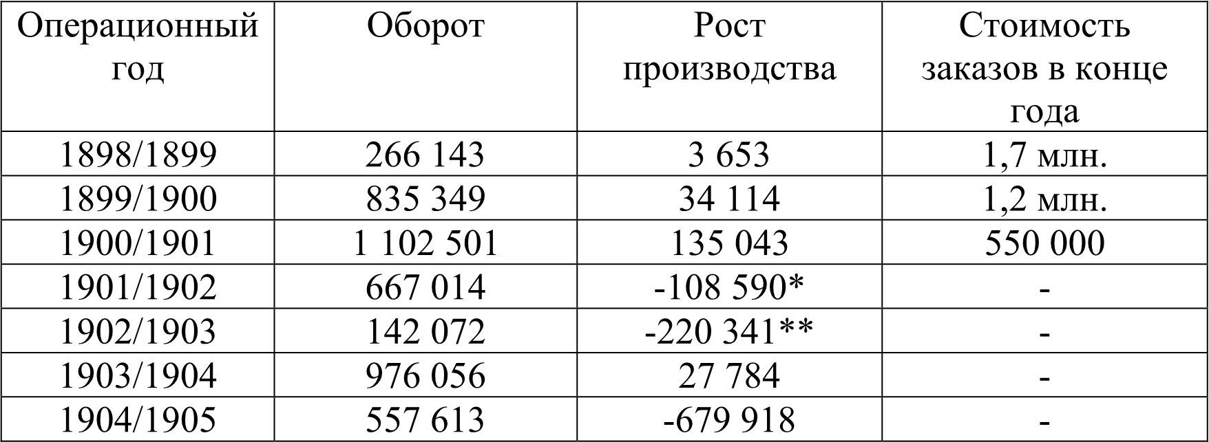 Промышленный кризис 1900-1903 гг. ухудшил положение акционерного общества. Заказов становилось все меньше, а соответственно падение производства приводило к долгам предприятия (см. табл. 2.7).