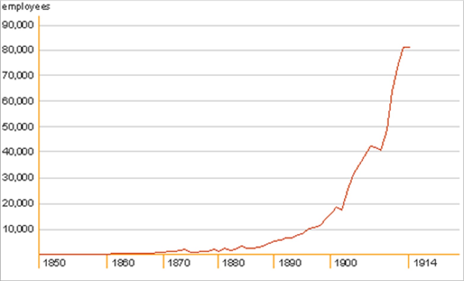 К 1914 г. в компании «Сименс-Шуккерт» работало более 2700 человек, из них в ростовском отделении 36.696 Компания быстро развивалась благодаря многочисленным заказам, приносившим ей немалую прибыль (график 2.1). Его показатели свидетельствуют также о медленном росте прибыли в 50-60-е гг. XIX в. и стремительном увеличении ее с середины 1880-х годов. Доход от ростовского отделения к 1913 г. составлял 117 144 рубля.697