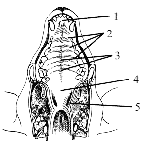Рис. 12. Твердое нёбо и дорсальная стенка глотки собаки: 1 – резцовый сосочек(papilla incisiva), 2 – нёбные валики(rugae palatinae), 3 – нёбный шов(raphe palati), 4 – мягкое нёбо(palatinum molle), 5 – ямка миндалины(fossa tonsillaris)