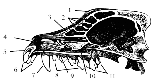 Рис. 13. Сагиттальный разрез черепа собаки: 1 – лобная кость (os frontale), 2 – лобные пазухи (sinus frontalis), 3 – носовая кость (os nasale), 4 – носовая полость (cavum nase), 5 – резцовая кость (os incisivum), 6 – резцовые зубы (dentes incisivi), 7 – клык (dens canimus), 8 – премоляры (dentes premolares), 9 – нёбный отросток верхней челюсти (processus polatinus maxilae), 10 – горизонтальная пластинка нёбной кости (lamina horizontalis ossis palatini), 11 – моляры (dentes molares)