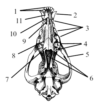 Рис. 14. Череп собаки с вентральной поверхности: 1 – резцовые зубы(dentes incisivi), 2 – клык(dens caninus), 3 – премоляры(dentes premolares), 4 – моляры(dentes molares), 5 – височный отросток скуловой кости(processus temporalis ossis zygo-matici), 6 – хоаны(choanae), 7 – горизонтальная пластина нёбной кости(lamina horizontalis ossis polatini), 8 – большое нёбное отверстие(foramen palatinum majus), 9 – нёбная щель(fissura palatina), 10 —межрезцовый канал(canalis interincisivus), 11 —тело резцовой кости(corpus ossis incisivi)