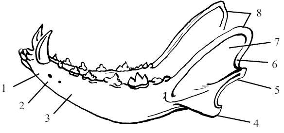 Рис. 15. Нижнечелюстная кость собаки: 1 – резцовая часть тела (pars incisiva), 2 – подбородочное отверстие (foramen mentale), 3 – коренная часть тела (pars molaris), 4 – угловой отросток (processus angularis), 5 – суставной отросток (processus articularis), 6 – челюстная вырезка (incisura mandibule) 7 – челюстная ветвь и ямка массетера (ramus mandibularis, fossa mas-seterica), 8 – мышечный отросток (processus muscularis)