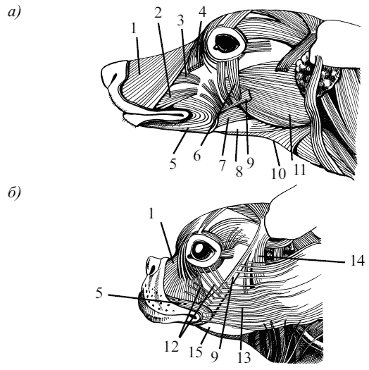 Рис. 16. Мышцы головы собаки: а) долихоцефал, б) брахиоцефал; 1 – носогубной подниматель (m.levator nasolabialis), 2 – клычковая мышца (m.caninus), 3 – специальный подниматель верхней губы (m.levator labii superiorius proprius), 4 – наружная щечная мышца (m.malaris), 5 – круговая мышца рта (m.orbicularisoris), 6 – опускатель нижнего века (m.depressor palpebrae inferiores), 7 – глубокая часть щечного мускула (parb molaris mi. buccinatoris), 8 – двубрюшный мускул, его оральное брюшко (venter rostralis mi. digistrici), 9 – скуловая мышца (m.zygomaticus), 10 – подъязычночелюстной мускул (m.mylohyoideus), 11 – жевательный мускул (m.masseter), 12 – подкожная мышца век (m.malaris), 13 – кожная мышца шеи и головы (m.cutaneus colli), 14 – глубокий слой подкожной мышцы (m.eius partes aberrantes), 15 – нижняя челюсть (mandibula)