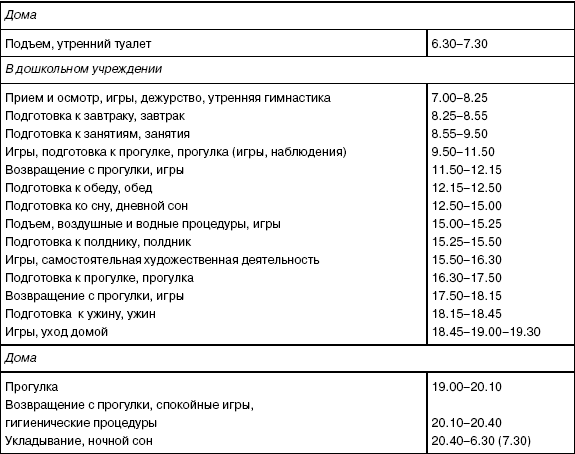 Примечание. Режим дня составлен с расчетом на 12-часовое пребывание ребенка в детском саду. Он может быть скорректирован с учетом работы конкретного ДОУ (времени года, климата, длительности светлого времени суток и т. п.). В теплое время года жизнь детей по возможности должна проходить на участке (воздухе).
