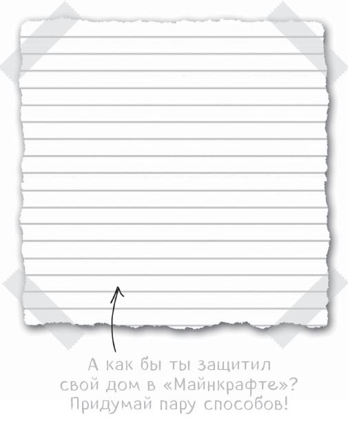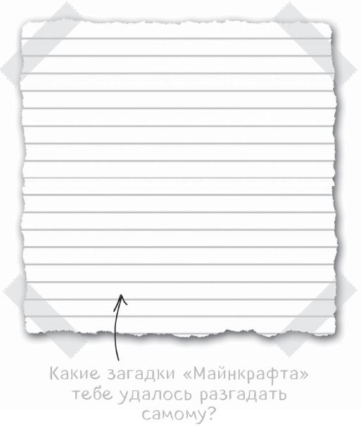 Я осторожно подкрался к столу с летающей книгой и взглянул на название – «Загадки “Майнкрафта”!». Я уже решил достаточно загадок лишь для того, чтобы попасть в дом-кролик, и большинство из них могло меня УБИТЬ! Я совершенно не готов к НОВЫМ загадкам «Майнкрафта», да еще и в неизвестном мире! Кто знает, насколько они болезненны? Или даже смертельны?! Пожалуй, какое-то время я буду держаться подальше от этой книги (ОЧЕНЬ ДОЛГОЕ время).