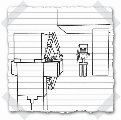 Мы увидели друг друга одновременно. Оба схватились за луки, натянули тетиву и выстрелили друг в друга! Он мигнул красным и отступил назад! Я попал в него! Потом – ОХ! Он тоже в меня попал! Как можно быстрее я выстрелил второй раз. Скелет сделал то же самое. После выстрела я отскочил в сторону, чтобы уклониться от его стрелы. Скелет снова мигнул красным и отступил назад. Опять попадание! Но что еще лучше – похоже, я его серьезно ранил, потому что он больше не стал стрелять. Я достал третью стрелу. Натянул тетиву так сильно, что у меня рука задрожала, а потом отпустил ее. Стрела со свистом полетела и сбила скелета с ног! Он исчез в облаке белого дыма. ДА! Вот это я и называю талантом лучника!