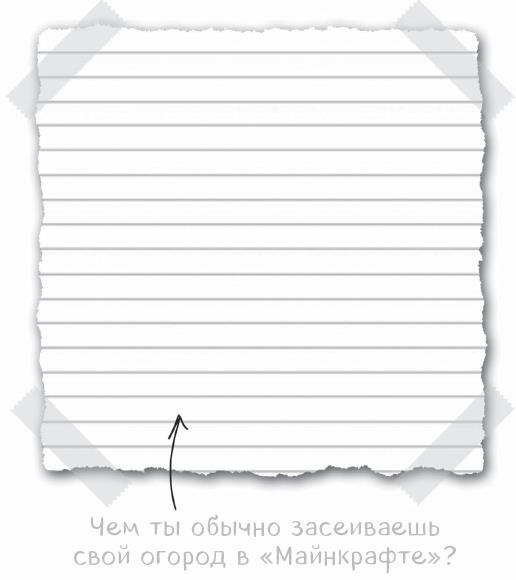 И тут я обратил внимание на одну закономерность. При сборе урожая спелая пшеница давала одну пшеницу и одну кучку семян. Одно съешь – другое посади. При этом спелая картошка и морковка обычно давали более одной картошки или морковки. Может, и у них работает принцип «одно съешь – другое посади»? Если это так, то я внезапно понял, как выращивать в «Майнкрафте» ВСЁ! Ура!