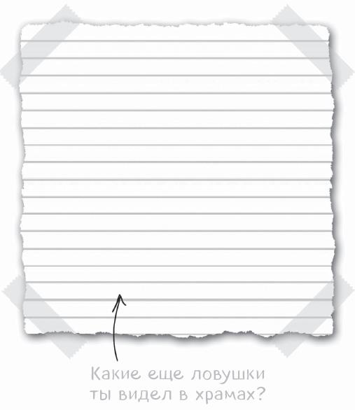 Я крался по темному узкому коридору, стараясь держаться поближе к покрытой лианами стене. Моя нога что-то задела. КЛИК! ФЬЮТЬ! БАМ! Стрела просвистела у меня над ухом и воткнулась в стену позади меня! Здесь ДЕЙСТВИТЕЛЬНО были ловушки!