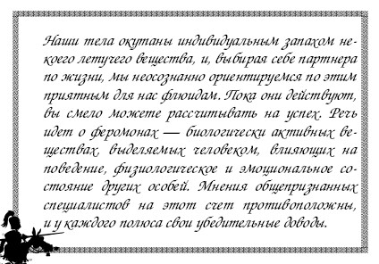 Вас увлечет невзрачный человек, чей запах вам окажется приятным. И наоборот, даже внешне привлекательный партнер может оттолкнуть вас от себя плохим запахом, не поможет и количество вылитой на него туалетной воды. Даже самый изысканный парфюм не забьет личный запах.