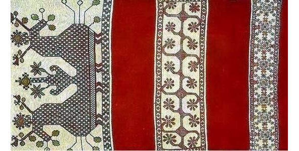 С развитием техники ткачества древние мастерицы неолита или энеолита смогли перенести сложные орнаменты из ромбов и меандров непосредственно в структуру ткани. Такой древний орнамент коврового типа, практически идентичный мезинскому и ранненеолитическому, можно без труда обнаружить на льняных холстах, бытовавших в северорусских деревнях еще в начале 20 века. Выполненные в многоремизной технике, они все сплошь покрыты ромбо-меандровым узором, получающимся при сложном переплетении нитей основы и утка. Из такого холста, как правило, делались полотенца, скатерти, юбки, к которым пришивались полосы проставок, набранных красными нитками по белому полю. Орнамент этих проставок зачастую очень похож на древний ромбо-меандровый, но в то время как фактура белого холста повторяет древние композиции практически без изменений, на проставках мы видим как бы фрагменты архаической схемы, её разделенные и сгруппированные по каким-то новым принципам детали.
