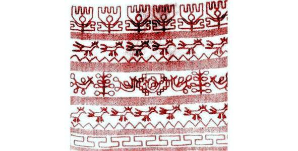 Возвращаясь к европейской части нашей страны, в данном конкретном случае к северорусским землям, мы должны сказать, что вопреки господствующему до сих пор в науке убеждение в той, что для северорусского региона характерны, прежде всего, сюжетные композиции, как в вышивке, так и в браном ткачестве, геометрически орнамент играл еще до 20—30 годов 20 века огромную роль в текстильном декоре. Причем на браных проставках, выполненных руками северорусских крестьянок в конце 19- начале 20 века сохранились не отдельные элементы андроновского орнамента, не поздние его трансформации, а целые орнаментальные комплексы классического коврового узора, о ритуальном характере которого говорилось выше. Такие орнаменты, решенные в большинстве случаев в древней красно-белой цветовой гамме, состоящие из меандров, треугольников, зигзагов, ромбов, свастик, «гуськов», оформляют зарукавья, подолы и оплечья женских рубах, края передников, пояса, концы полотенец, т.е. ритуальные, сакрально отмеченные вещи, выполнявшие кроме чисто бытовых еще и магические и обереговые функции. Как и во всем андроновском орнаменте, в северорусском браном ткачестве композиция делится на три горизонтальные зоны, причем верхняя и нижняя зачастую дублируют друг друга, а средняя, как правило, несет на себе важнейшие с точки зрения самантической значимости узоры. Именно здесь можно встретить самые разнообразные мотивы меандра, «гуськов», свастик, абсолютно идентичные андроновским, и их схождения поразительны.