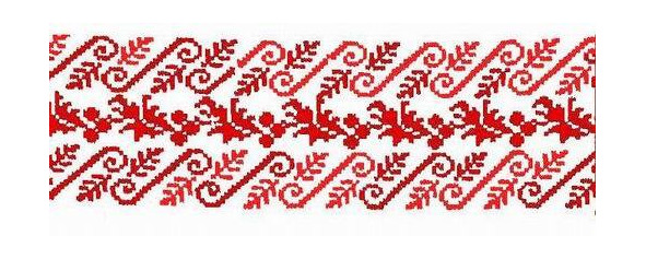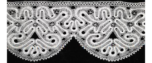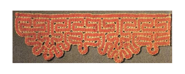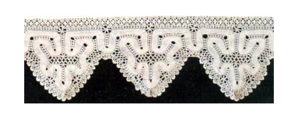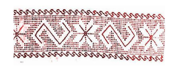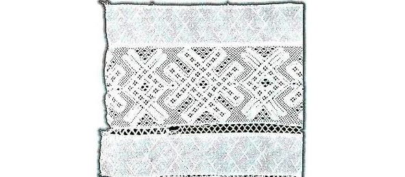 Основа орнамента в таком кружеве, выполняющемся для оформления концов полотенец и подзоров свадебных простыней, представляет собой плотную, шириной до 1 сантиметра ленту, очень часто насыщенного красного цвета, которая, прихотливо извиваясь, строит узор, и, прежде всего узор меандровый. Интересно, что такое декоративное решение характерно только для северорусского, и в частности, для вологодского кружева (табл. 3).
