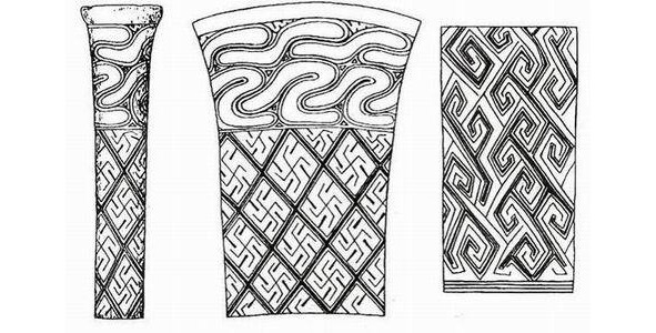 С такими выводами согласны отнюдь не все исследователи, но одно бесспорно; из того, что мы имеем на сегодняшний день, все-таки можно сделать вывод, что в праславянской тшинецко-комаровской культуре те же знаки, что и в Триполье – меандр, ромб, свастика, гуськи – выполняют одни и те же сакральные функции знака – оберега или магического заклинания, обращенного к богам и духам. Обращаясь далее к орнаментальным комплексам и.-и.– абашевской культуры, мы можем отметить, что здесь, как и в тшинецко-комарсвской культуре, и даже в ещё большей степени, орнамент состоит из различных меандров, свастик и гуськов. В отличие от абашевской, в орнаментальных комплексах срубной культуры мотив меандра и сложнопрорисованного креста встречается довольно редко. Основной составляющей декора керамики срубной культуры (16—12 век до н.э. по Б. Ч. Гракову) являются цепочки ромбов, ромбические сетки и ряды треугольников на плечиках сосудов, тулово зачастую оформляется характерными косыми крестами, иногда составленными из двух встречнопересекающихся – S-образных форм.
