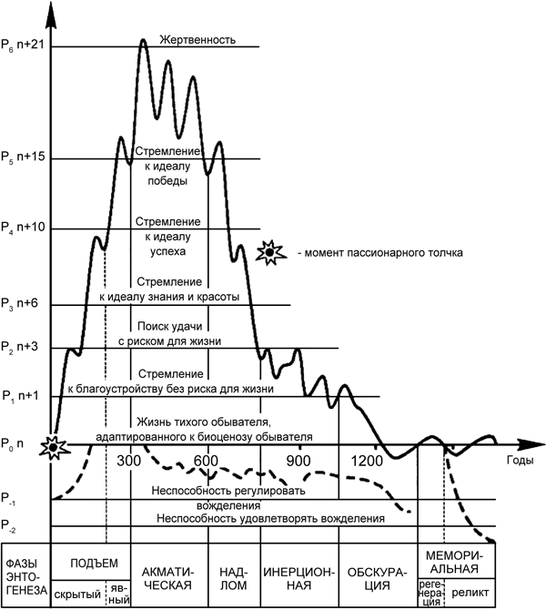 Гораздо важнее ось абсцисс, временное деление по фазам. Оно делается на основе обобщения исторических фактов и имеет вполне конкретный и объективный характер. Всего Гумилёв выделяет шесть фаз: фаза подъёма (300 лет), акматическая (столько же), фаза надлома (150–200 лет), фаза инерции и фаза обскурации (сильно варьируются в зависимости от исторической судьбы) и последняя фаза – мемориальная (при благоприятных условиях длится неопределённо долго)[20].