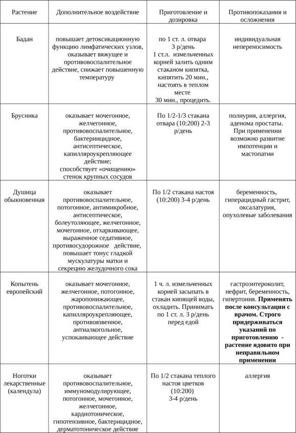 В таблице 1 представлены лекарственные растения, применение которых является достаточно эффективным способом стимуляции оттока тканевой жидкости.