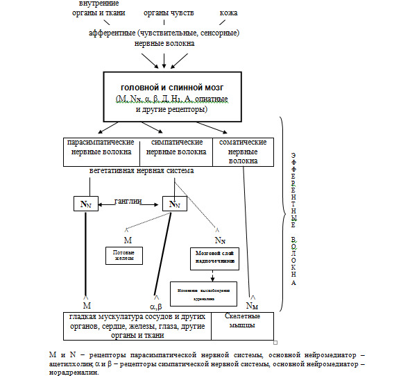 Высшим надсегментарным центром, расположенным в головном мозге и определяющим функциональную активность парасимпатических и симпатических отделов вегетативной нервной системы, являются центры, расположенные в головном мозге – миндалевидное тело, стриопаллидарная система, гипоталамус (схема 1). В нем сосредоточены центры, регулирующие кровообращение, дыхание, пищеварение, водный и солевой обмены, функцию гипофиза, эндокринного аппарата и т. д. В свою очередь активность гипоталамуса контролируется центрами лимбической системы и премоторной зоны коры головного мозга. Именно в эти центры по чувствительным (афферентным, сенсорным) нервным волокнам поступают импульсы от различных органов и тканей (см. схему). По ряду физиологических и морфологических признаков эфферентные нервные волокна (идущие от мозга к органам и тканям) подразделяются на соматические и вегетативные (парасимпатические и симпатические), а по способу синаптической передачи возбуждения в основном – на холино- и адренергические, при активации которых выделяются медиаторы – ацетилхолин (холинорецепторы), норадреналин и дофамин (адренорецепторы).