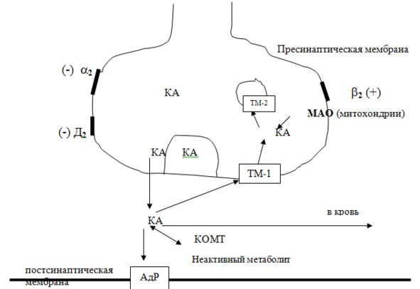 (Примечание: Адр – адренорецептор, КА – катехоламины, КОМТ – катехол-О-метилтрансфераза, МАО – моноаминооксидаза, ТМ-1 – транспортный механизм – обратный нейрональный захват КА, ТМ-2 – транспортный механизм – перенос свободных КА из нейроплазма в гранулы, (+) – повышение выброса КА, (-) – снижение выброса катехоламинов.)