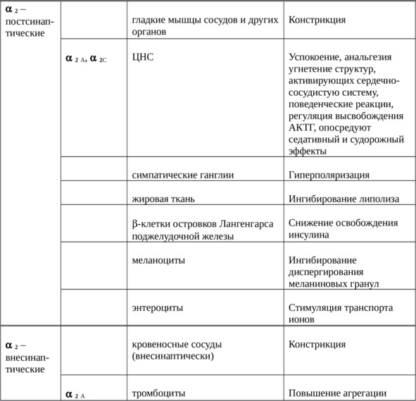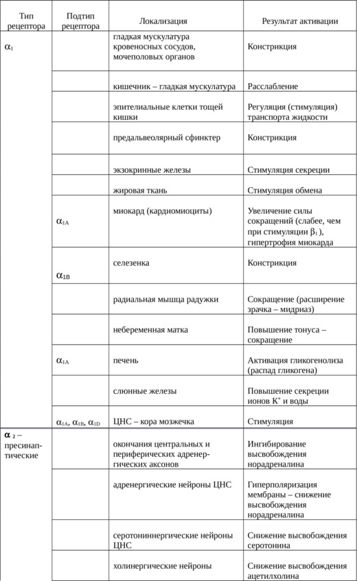 Таблица 2. Локализация α-адренорецепторов и результаты их активации