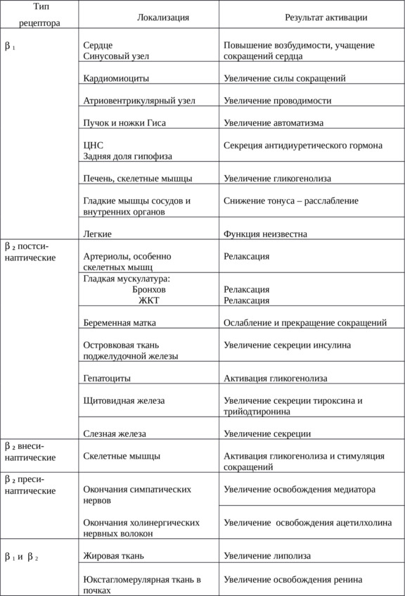 Локализация и результат активации β-адренорецепторов представлены в таблице 3.
